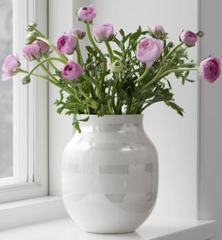 Med perlemorsfargen oppstår et vakkert, underuttrykt farge-i-farge-utseende som passer elegant inn i den stilrene innredning. Stell til et elegant tablå med forskjellige, fargerike blomster, eller fyll den vakre perlemorsvasen med yndlingsblomstene dine og inviter våren inn døren. De klassiske Omaggio stripene er nå håndmalt med en diskret perlemornyanse som skaper et nydelig og nedtonet utseende mot den hvite keramikken.
